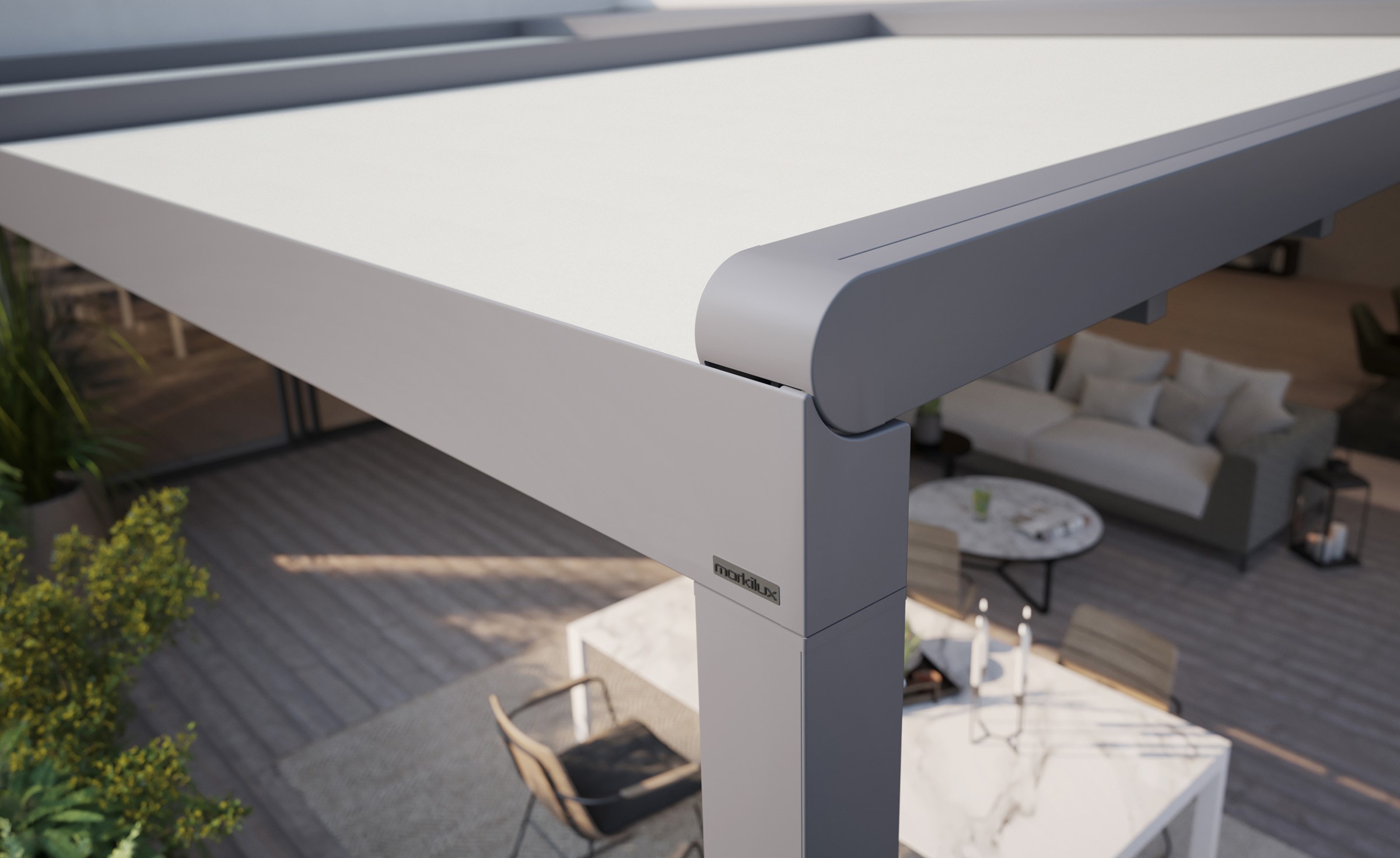 De Pergola Stretch is een minimalistisch en hoogwaardig PVC-Vouwdak. Door de ruimtebesparende vouwtechniek kunnen grote oppervlakte voorzien worden van schaduw, maar kun je nog steeds genieten van een optimaal lichtinval.