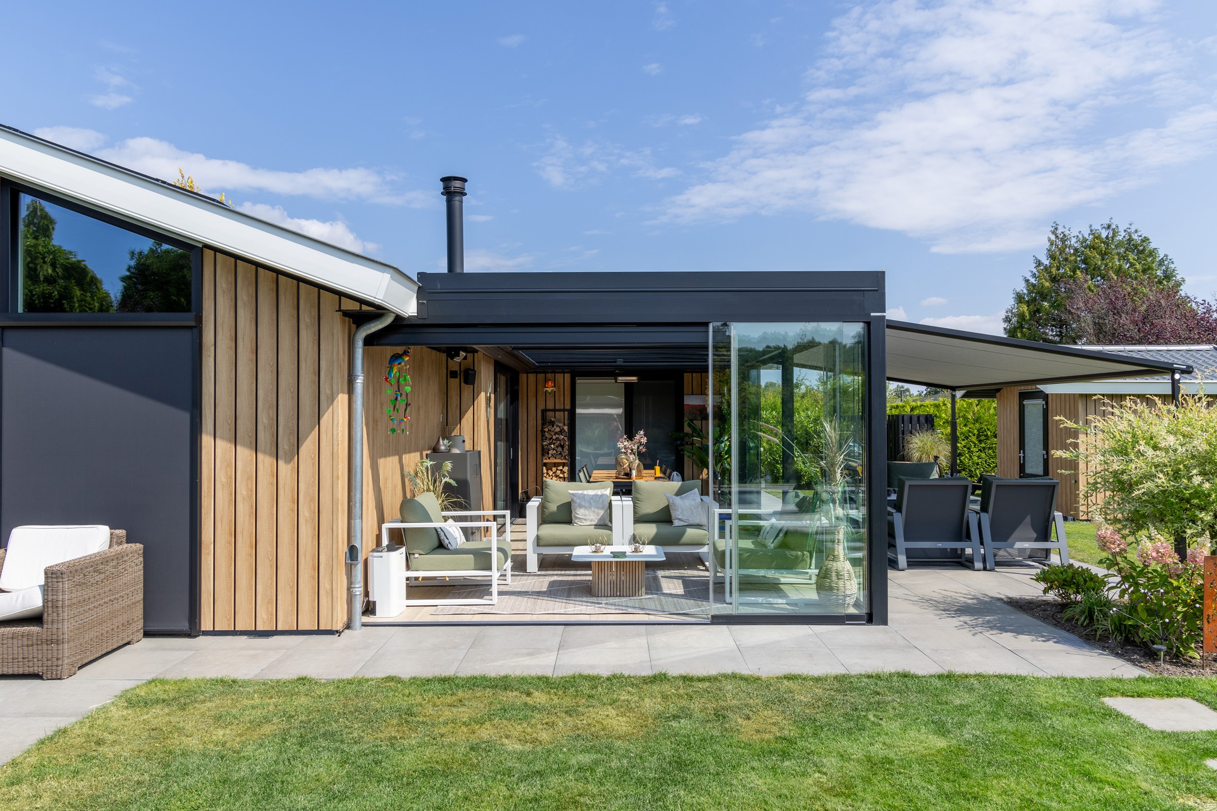 Met deze combinatie van de glasoverkapping, de warmtestralers en de Viva Pergola hebben de bewoners extra leefruimte gecreëerd rondom hun vakantiewoning, waardoor ze in elk seizoen optimaal kunnen genieten van hun tuin en terras, ongeacht de weersomstandigheden.