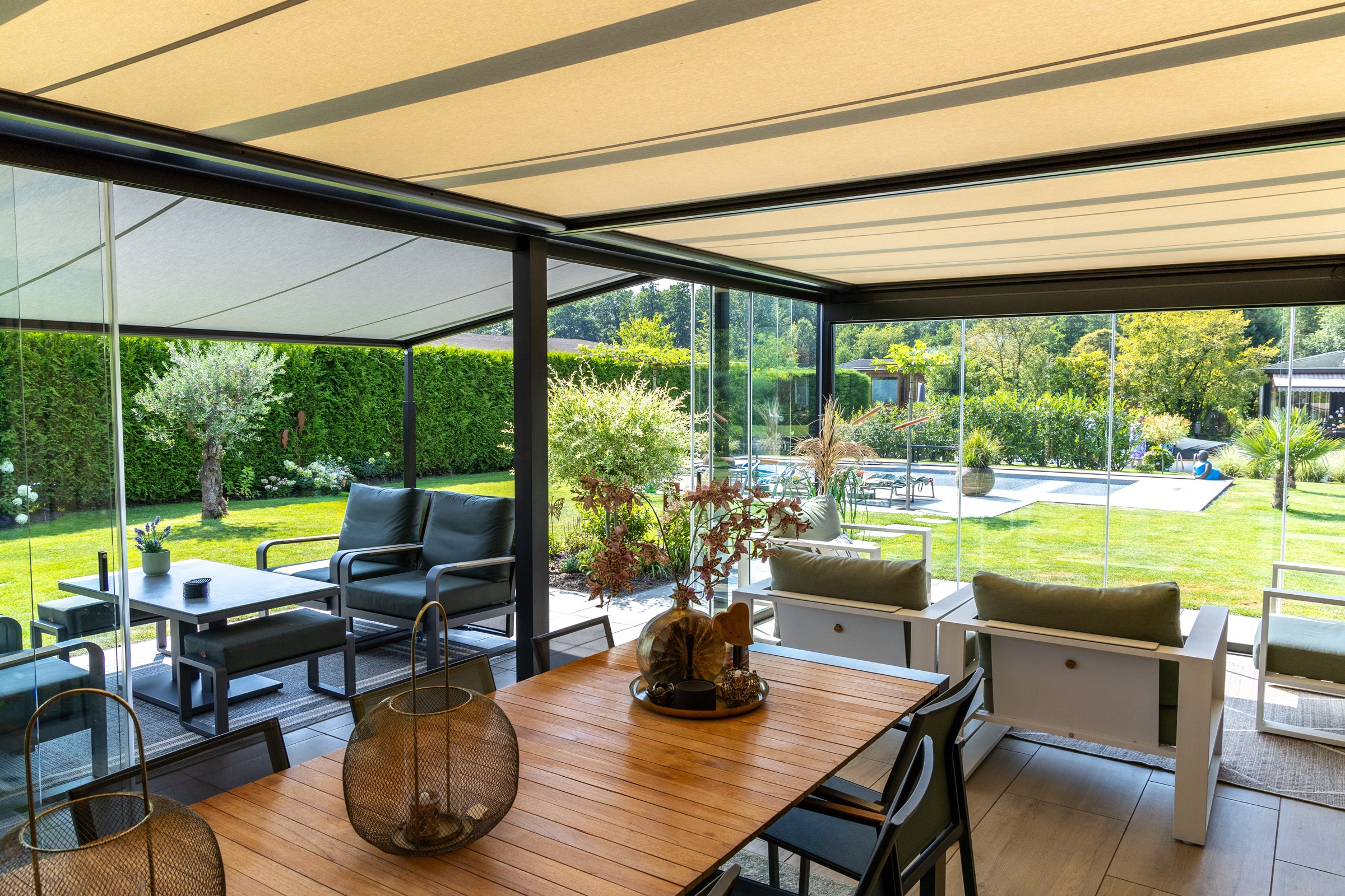 Deze pergola is direct aan de bestaande glasoverkapping bevestigd, waardoor de overkapping nu echt als tuinkamer kan worden gebruikt. De glazen wanden kunnen volledig worden gesloten, en op koude dagen in het voor- en najaar zorgen de warmtestralers voor een heerlijk warme en comfortabele sfeer. Als het weer warmer wordt vanaf mei, kunnen ze lekker onder de doekoverkapping zitten. Zo kunnen de bewoners het hele jaar door genieten van het buitenleven.