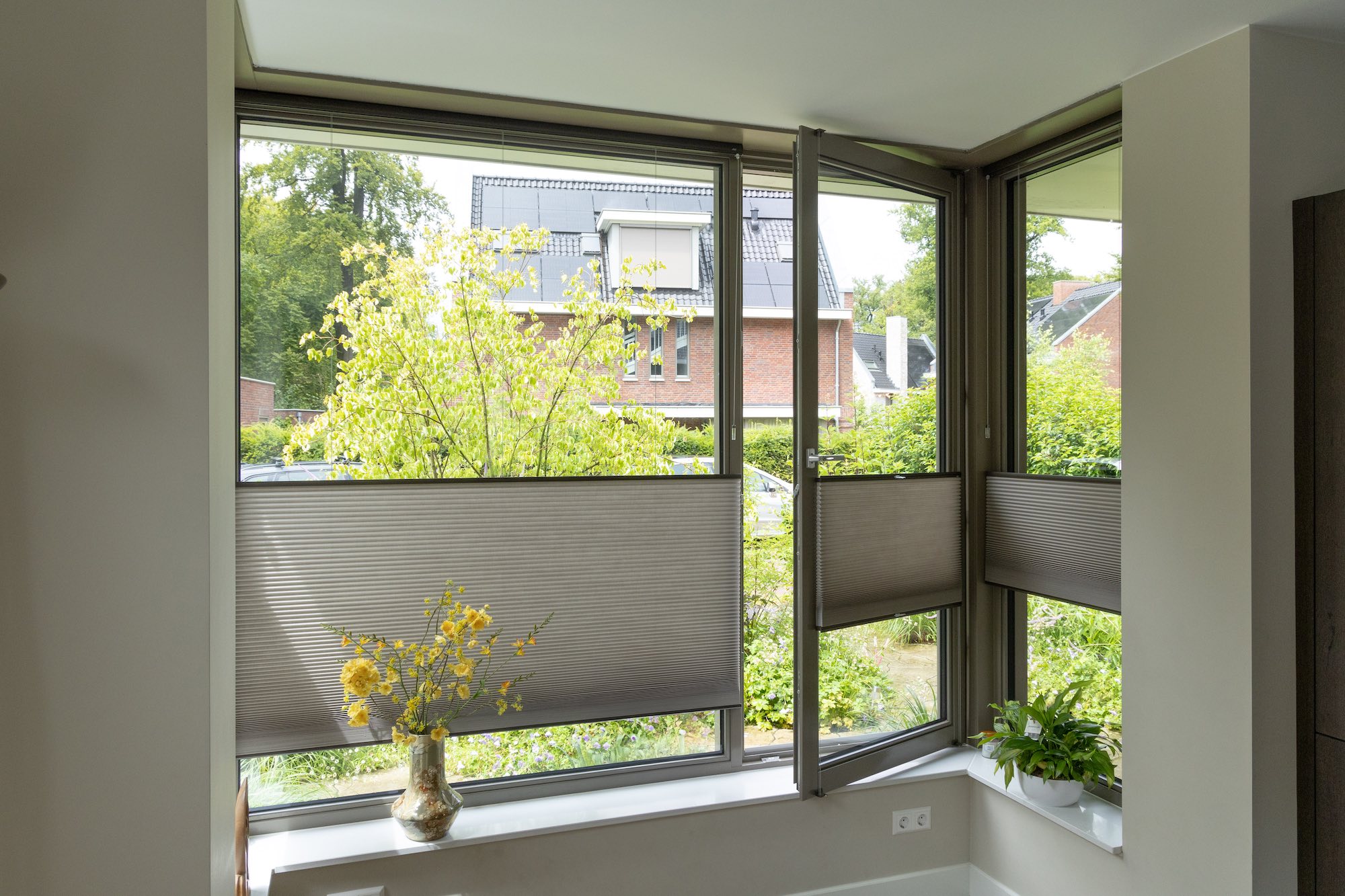 "Een ander groot voordeel van de Duette® Shades is dat ze ook op ons draaikiepraam geplaatst konden worden. Ambiance Van der Wal monteerde een ingespannen Duette® Shade met spanvoeten en spankoorden, direct op het raam. Zo kunnen we het raam makkelijk kantelen of volledig openen zonder dat de shades in de weg zitten. Het raam aankleden zonder ruimteverlies was belangrijk voor ons, en dit systeem werkt perfect!"