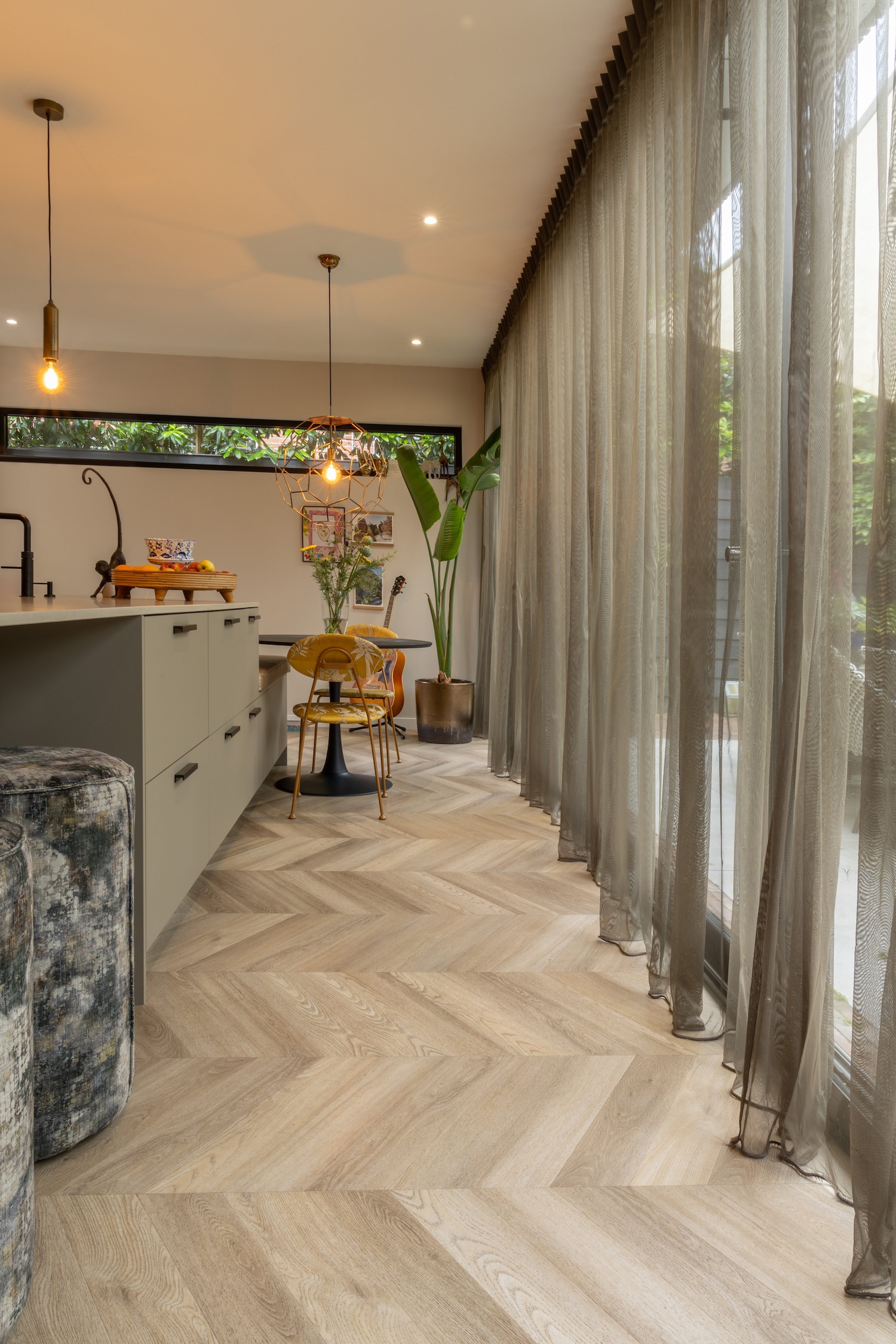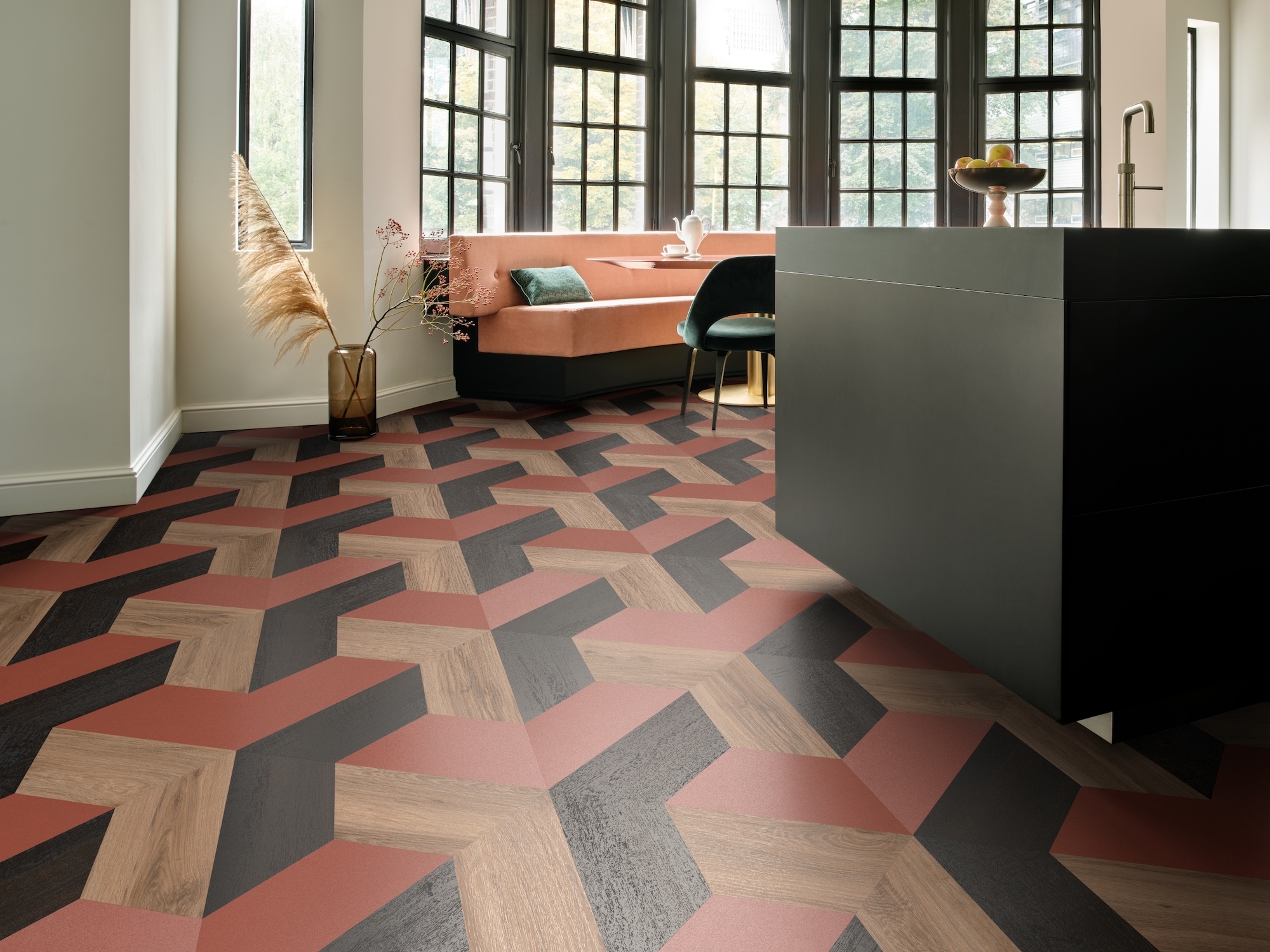 Voor wie op zoek is naar iets bijzonders, biedt de Moduleo Moods-collectie talloze creatieve opties. Door gebruik te maken van geometrische patronen zoals ruiten, zeshoeken en visgraat, kun je je vloer omtoveren tot een echte blikvanger. Met meer dan 110 combinatiemogelijkheden zijn deze vloeren geschikt voor elke stijl, van minimalistisch tot gedurfd en expressief.