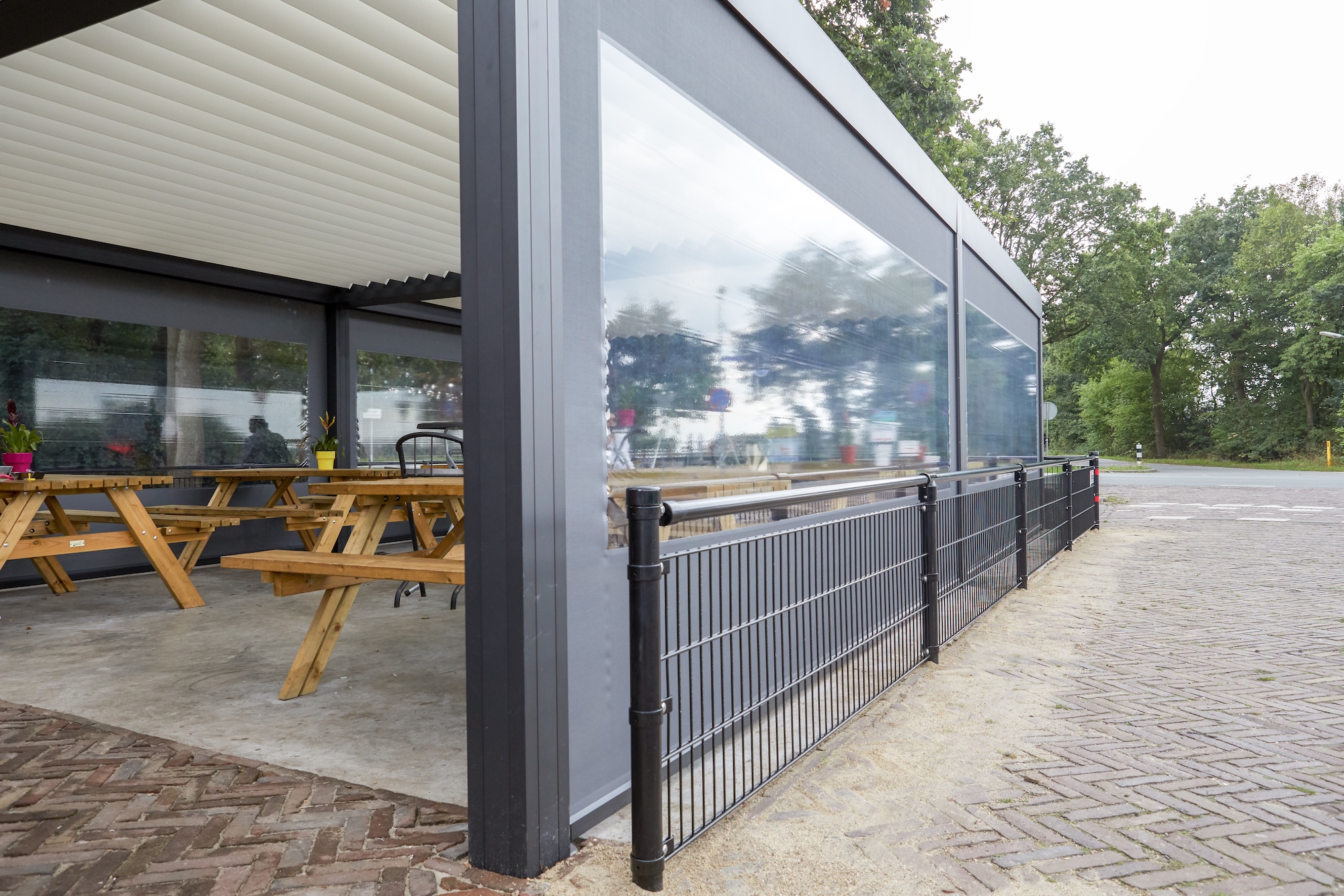 De zijkanten van de overkapping zijn voorzien van elektrisch bedienbare zipscreens die met een afstandsbediening omhoog gehaald kunnen worden. Wanneer de screens niet gebruikt worden, verdwijnen ze volledig in het dakframe, waardoor ze uit het zicht zijn. De screens zijn wind- en regenbestendig en hebben transparante zichtvensters, zodat gasten altijd kunnen genieten van het uitzicht op Vliegveld Hilversum.