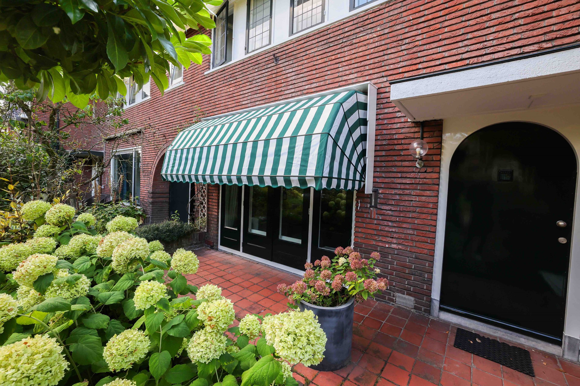 Het frame van de markies is uitgevoerd in hoogwaardig hout, zorgvuldig afgewerkt voor langdurige bescherming tegen weer en wind. De groen-witte strepen van het doek geven het geheel een frisse en klassieke uitstraling die perfect past bij het landelijke karakter van de woning in Eemnes. Dit tijdloze patroon is al decennialang populair en blijft geliefd om zijn heldere, uitnodigende uitstraling.