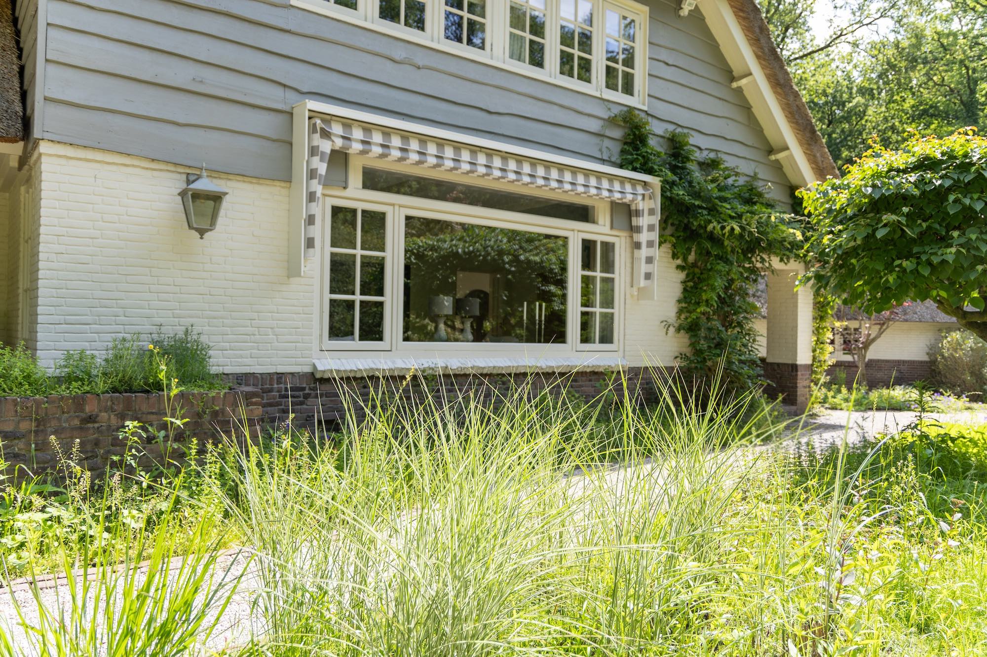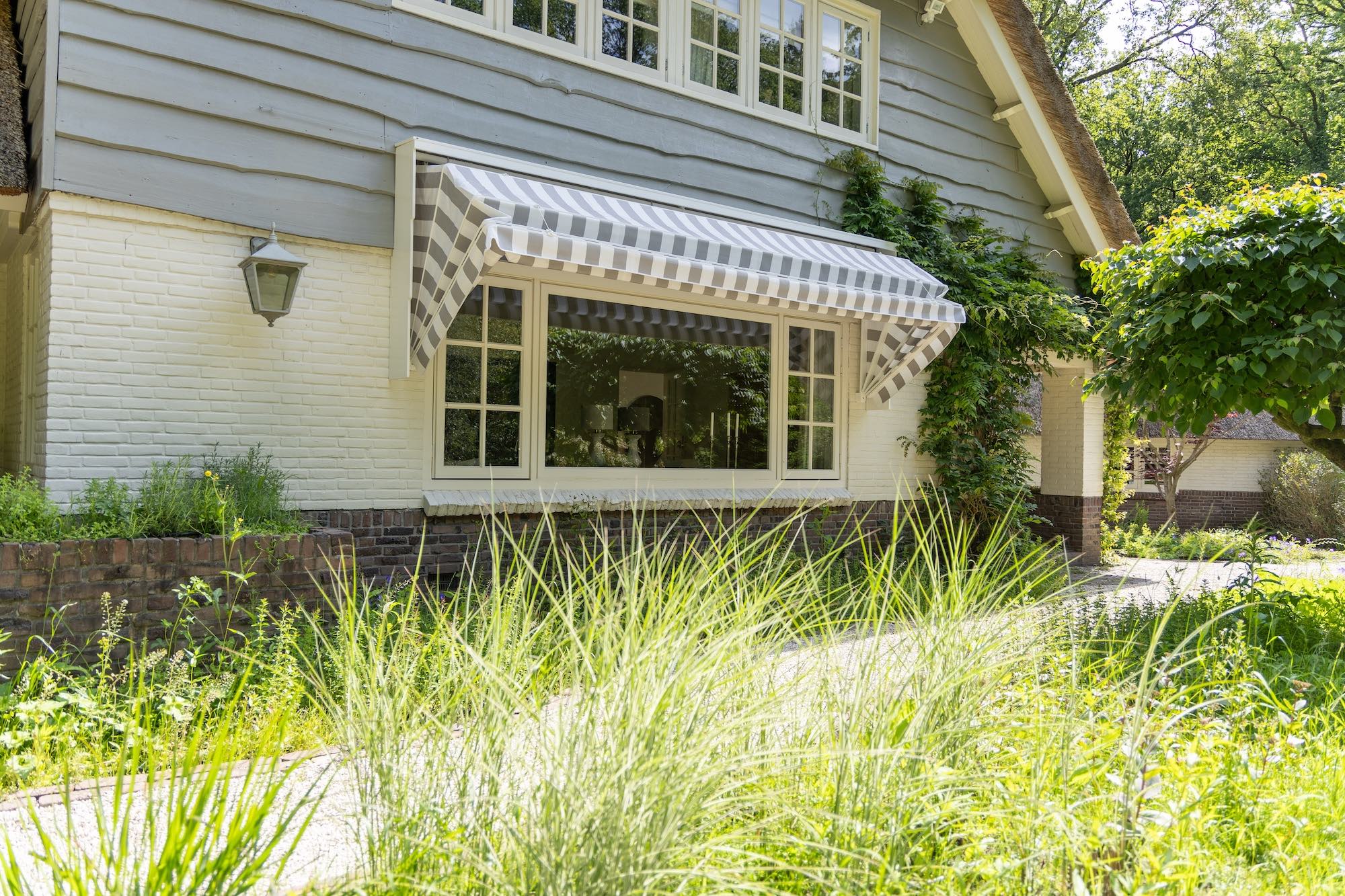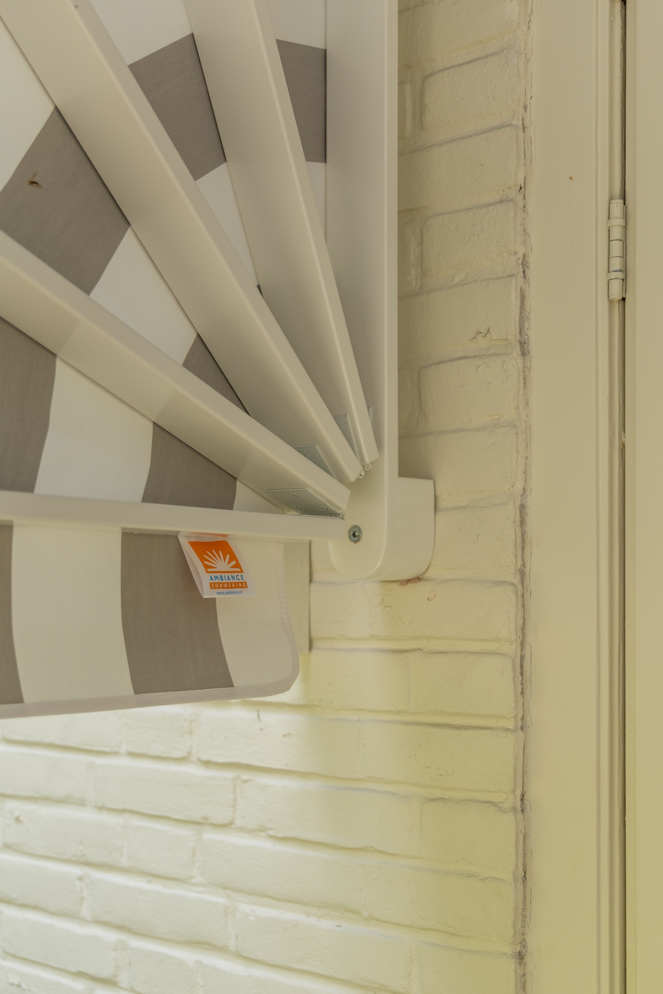 De markies is vervaardigd van hoogwaardig Scandinavisch greenhout, een houtsoort die bekendstaat om zijn sterkte en lange levensduur. Voor de ombouw en het frame is gebruikgemaakt van merantihout, geschilderd in RAL9010 wit. Deze witte afwerking sluit perfect aan bij het frisse karakter van de woning. Bij goed onderhoud gaat een houten markies als deze met gemak twintig jaar mee – en met een nieuwe verflaag na tien tot vijftien jaar zelfs nog veel langer. Regelmatig komen we markiezen tegen die al dertig jaar of ouder zijn en nog steeds in goede staat verkeren.