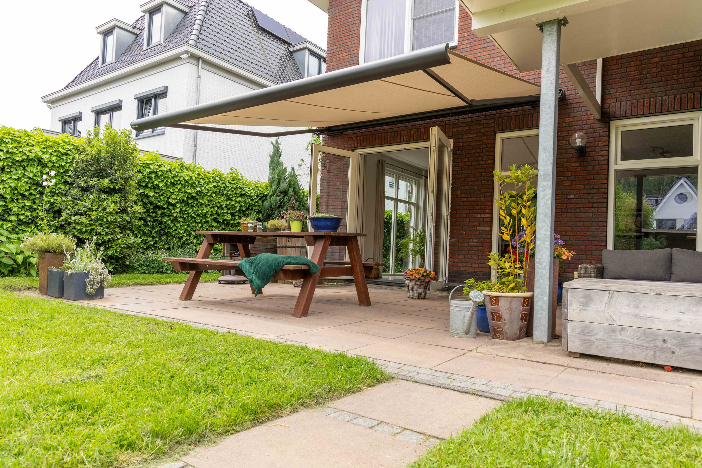 Met een royale uitval van drie meter zorgt het knikarmscherm voor een riante schaduwplek op het terras. Zo kunnen de bewoners volop genieten van lange zomerse dagen, zonder last te hebben van directe zon. Het zonnescherm houdt niet alleen de hitte op afstand, maar voorkomt ook dat het binnen in huis opwarmt, wat bijdraagt aan een aangenamer binnenklimaat.