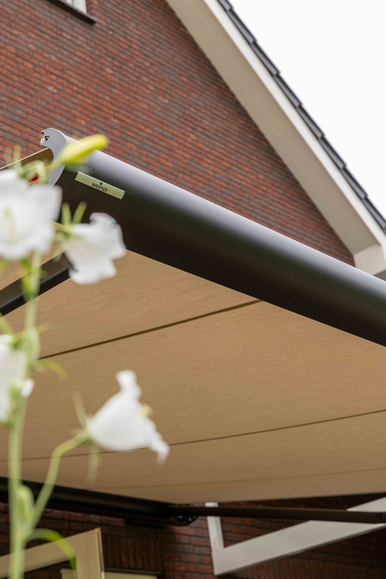 De doekkleur is zorgvuldig gekozen om een warme, natuurlijke sfeer te creëren. In dit project is het doek uitgevoerd in een rustige, lichte tint die voldoende zonlicht tegenhoudt, maar toch zorgt voor een open en lichte sfeer onder het scherm.