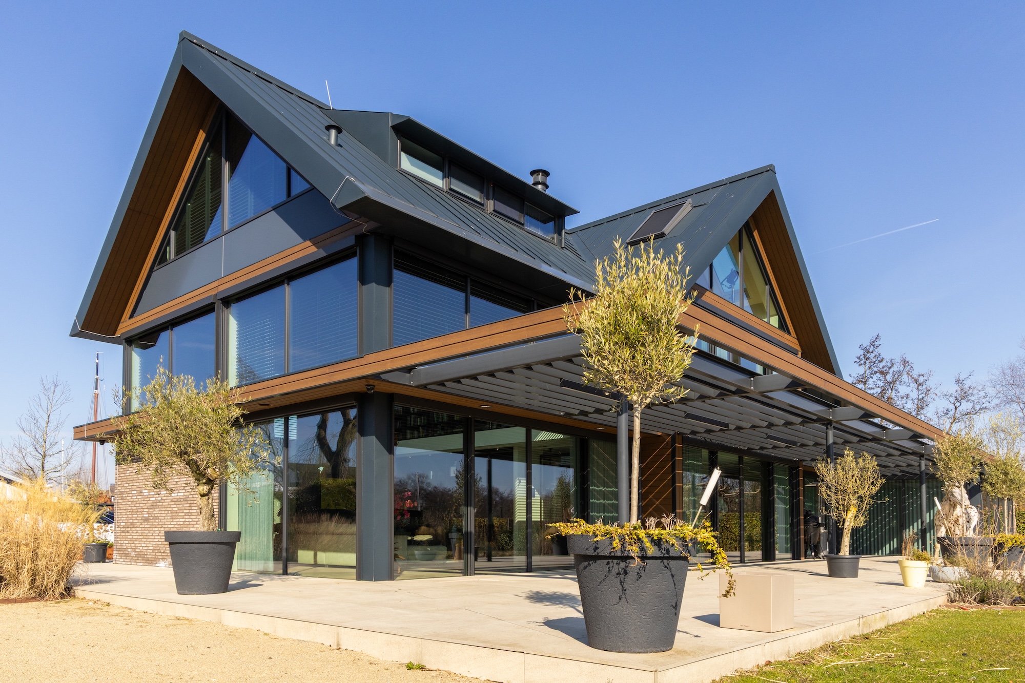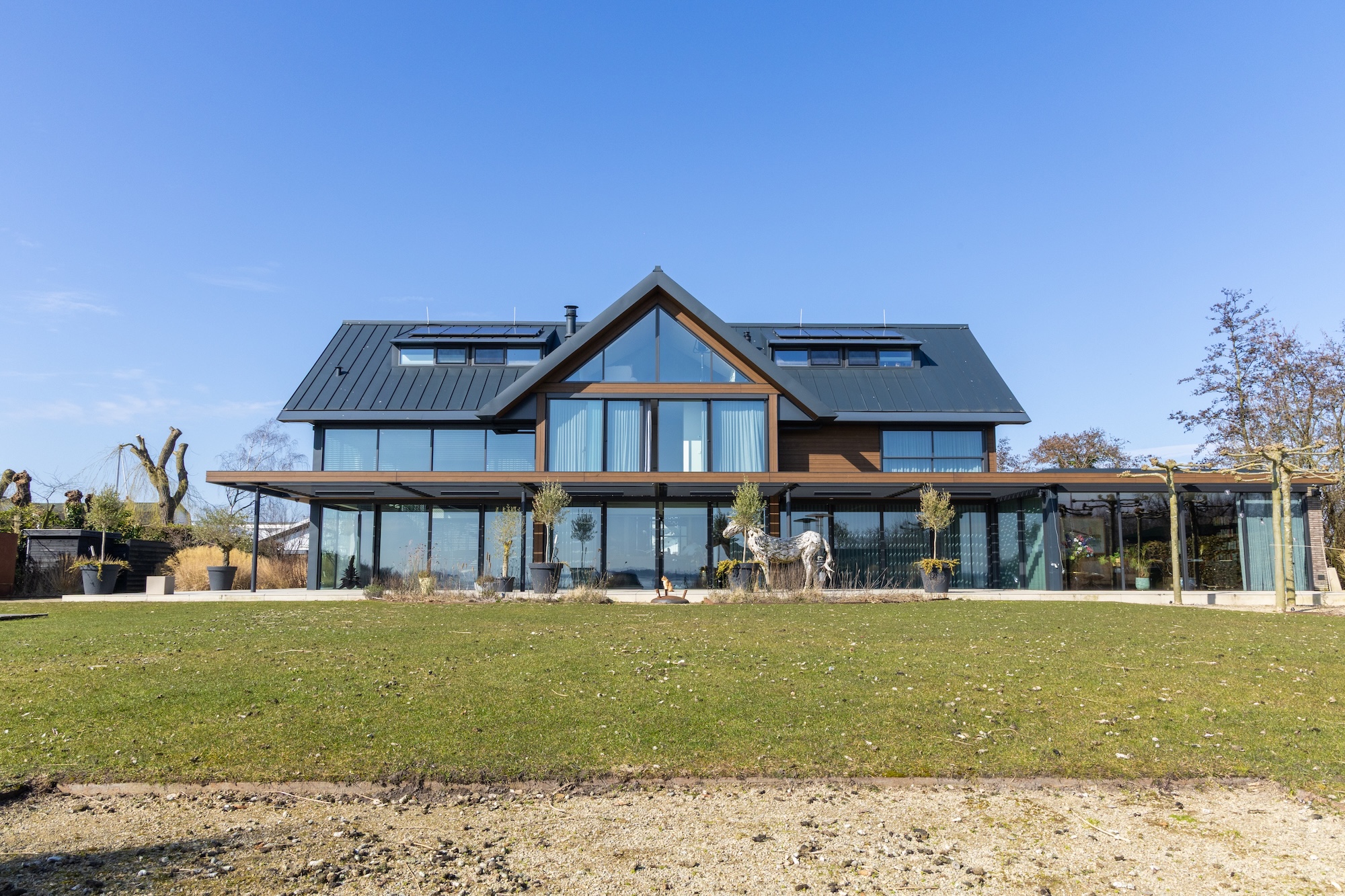 De woning in Nieuw-Loosdrecht is uitgerust met vloerkoeling en HR++ glas, maar dat bleek niet voldoende om de binnentemperatuur aangenaam te houden tijdens zonnige dagen. De zon schijnt de hele dag naar binnen, waardoor het ondanks alle voorzorgsmaatregelen vaak boven de 30 graden werd in huis. Voor de bewoners leidde dit tot een onaangenaam binnenklimaat. Een structurele oplossing was nodig – en die werd gevonden in hoogwaardige zonwering van Van der Wal.
