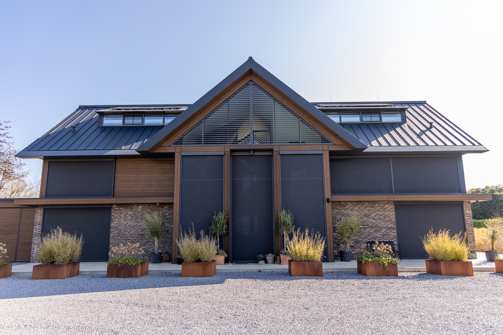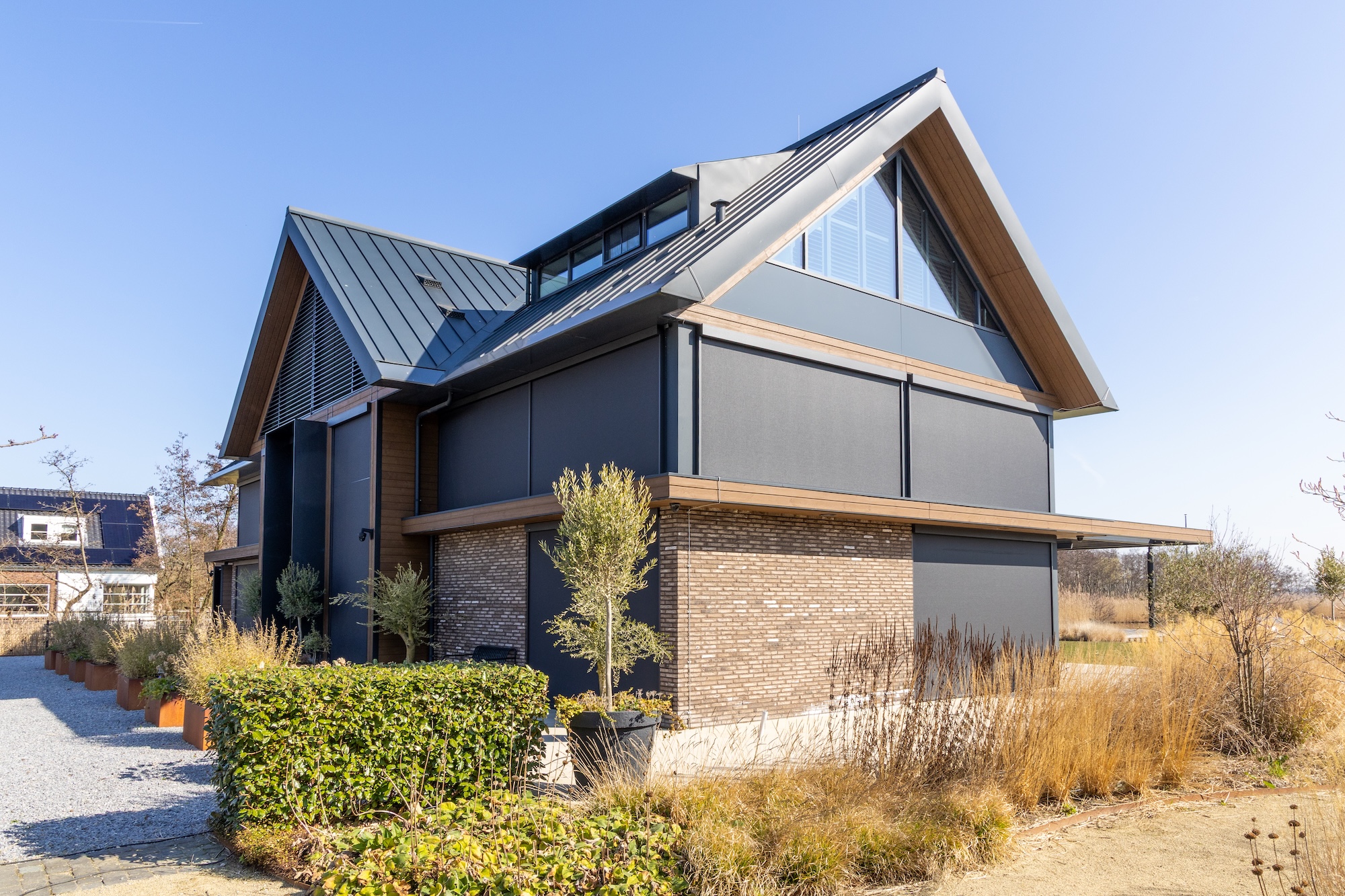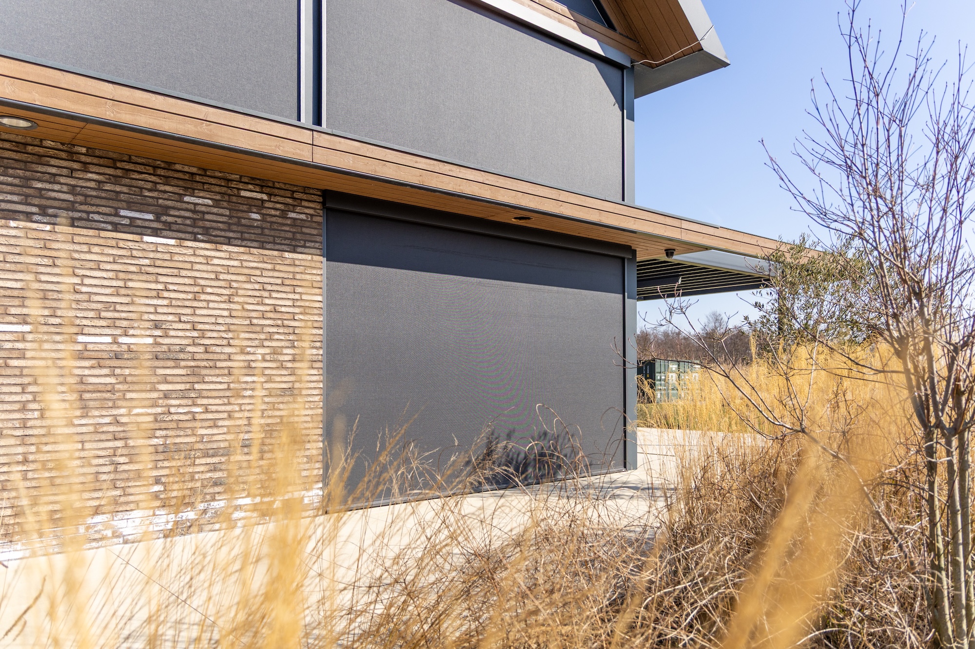 Met de montage van 29 screens is gekozen voor een volledige gevelbedekking met Zip-Screens Novara. Deze op maat gemaakte zonneschermen vormen een strak geheel dat perfect aansluit bij het gevelbeeld. Door de slimme techniek van de Zip-Screen wordt het doek onder spanning in de geleiders gehouden, waardoor het altijd strak staat en windvast is. Dit maakt ze bijzonder geschikt voor grote ramen en gevels zoals bij deze woning.