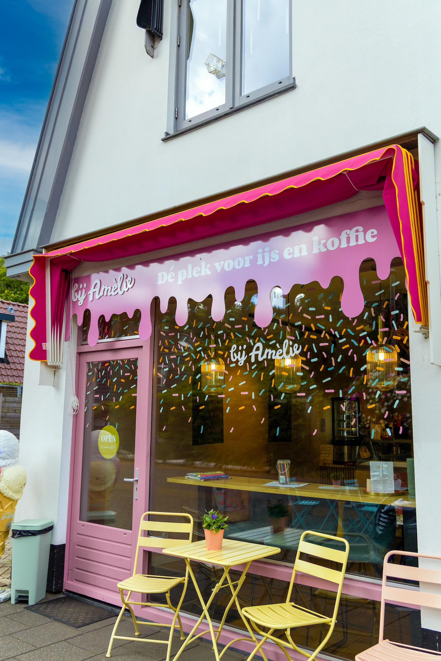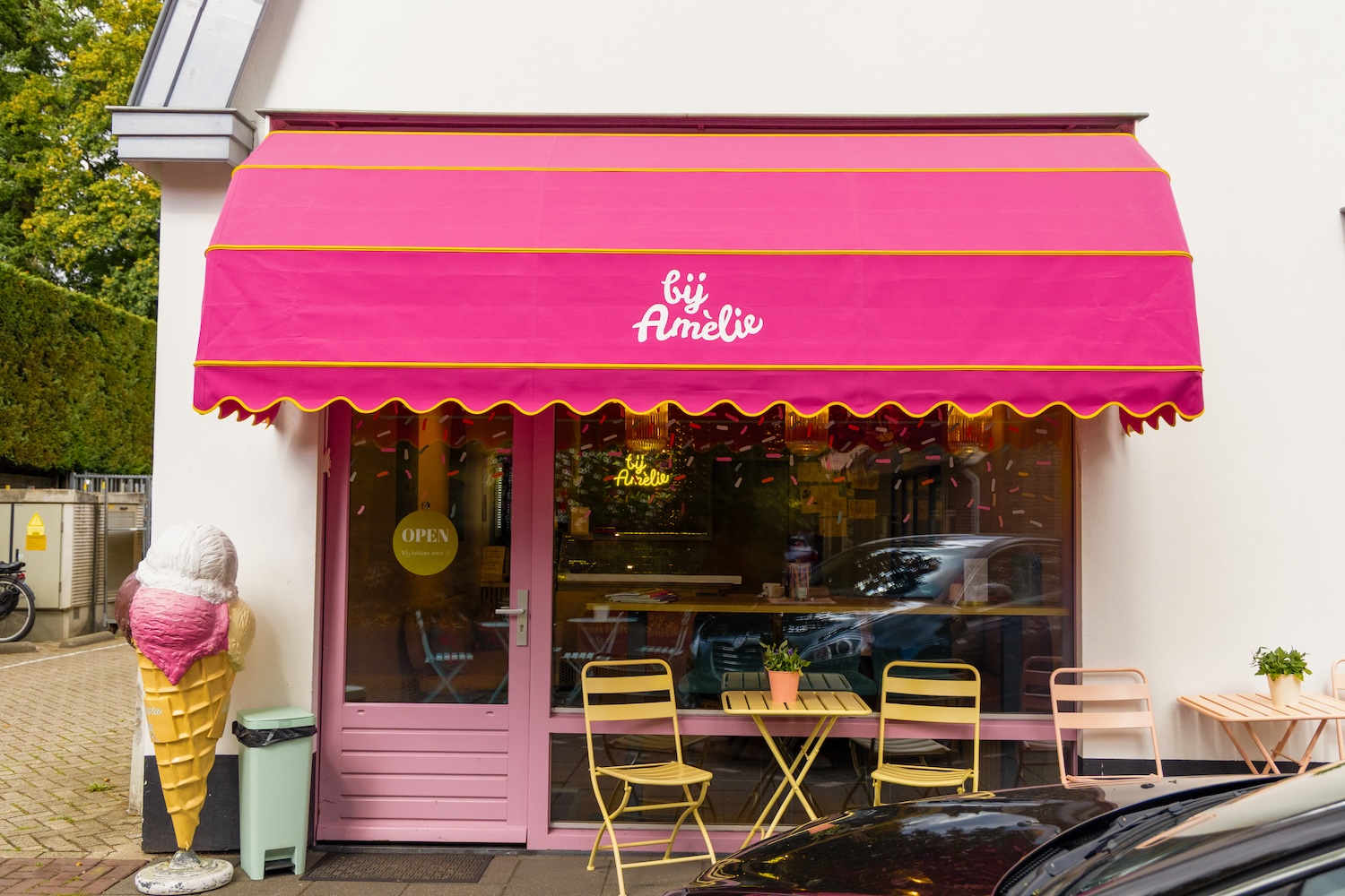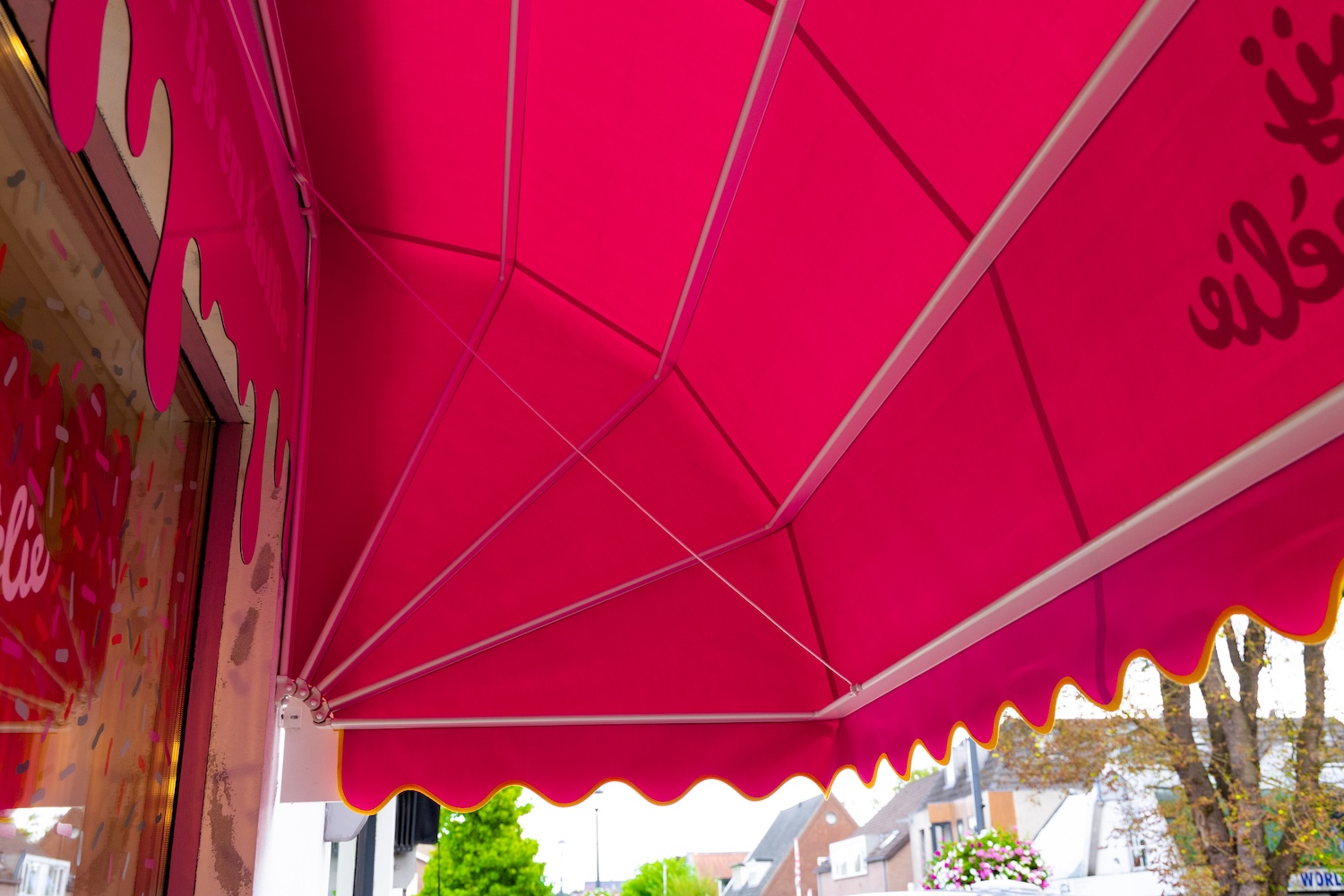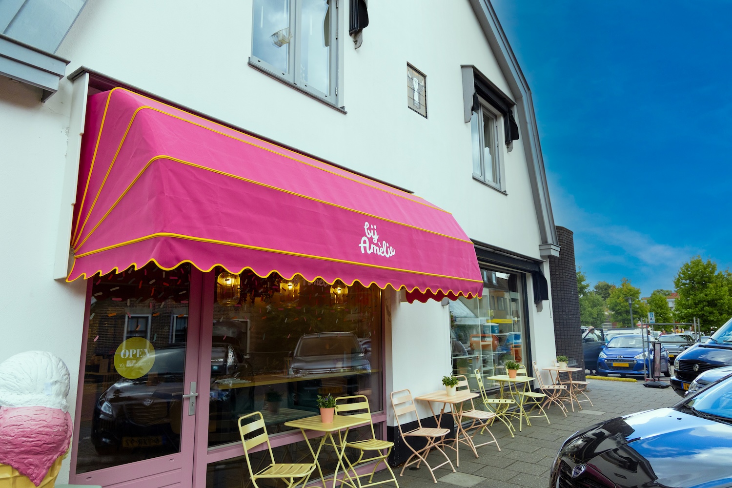 De markies in Loosdrecht is uitgevoerd in frisse, zomerse kleuren die perfect passen bij de vrolijke sfeer van de ijssalon. De roze tint zorgt voor een warme, uitnodigende uitstraling, terwijl het geheel mooi aansluit bij de kleur van de kozijnen en gevel. Hierdoor vormt de markies een harmonieus geheel met het pand, zonder dat het te druk oogt.