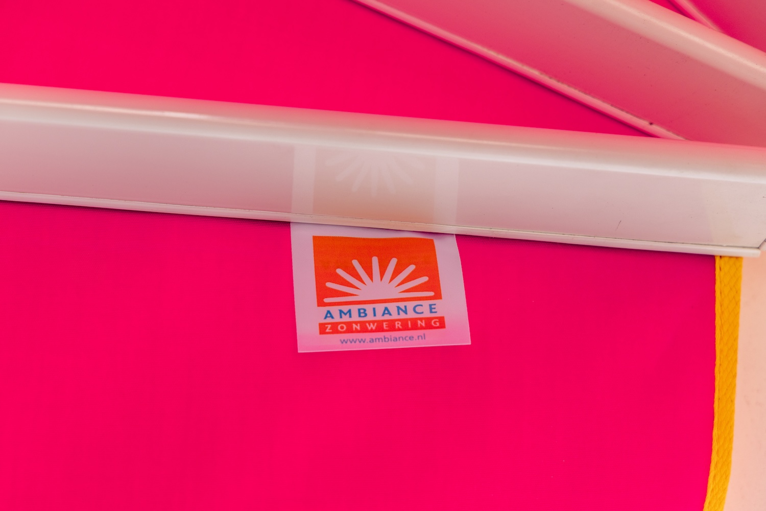 De gekozen kleurstelling maakt deze zonwering niet alleen opvallend, maar ook onderscheidend. Veel voorbijgangers blijven even staan om te kijken, en precies dat is het doel van een goed ontworpen markies: functioneel én herkenbaar.