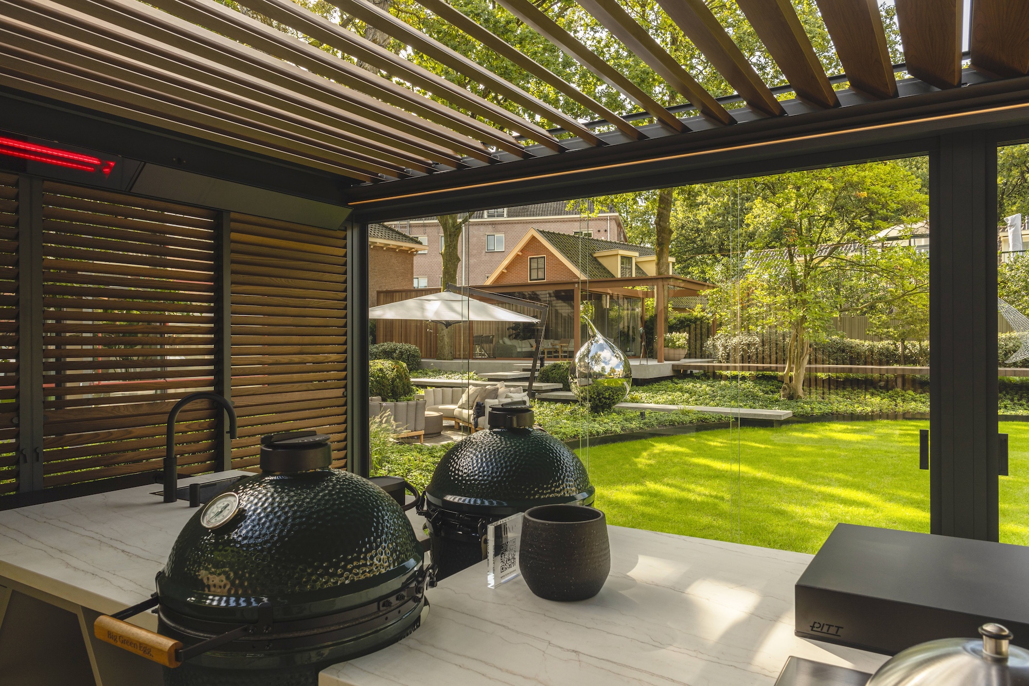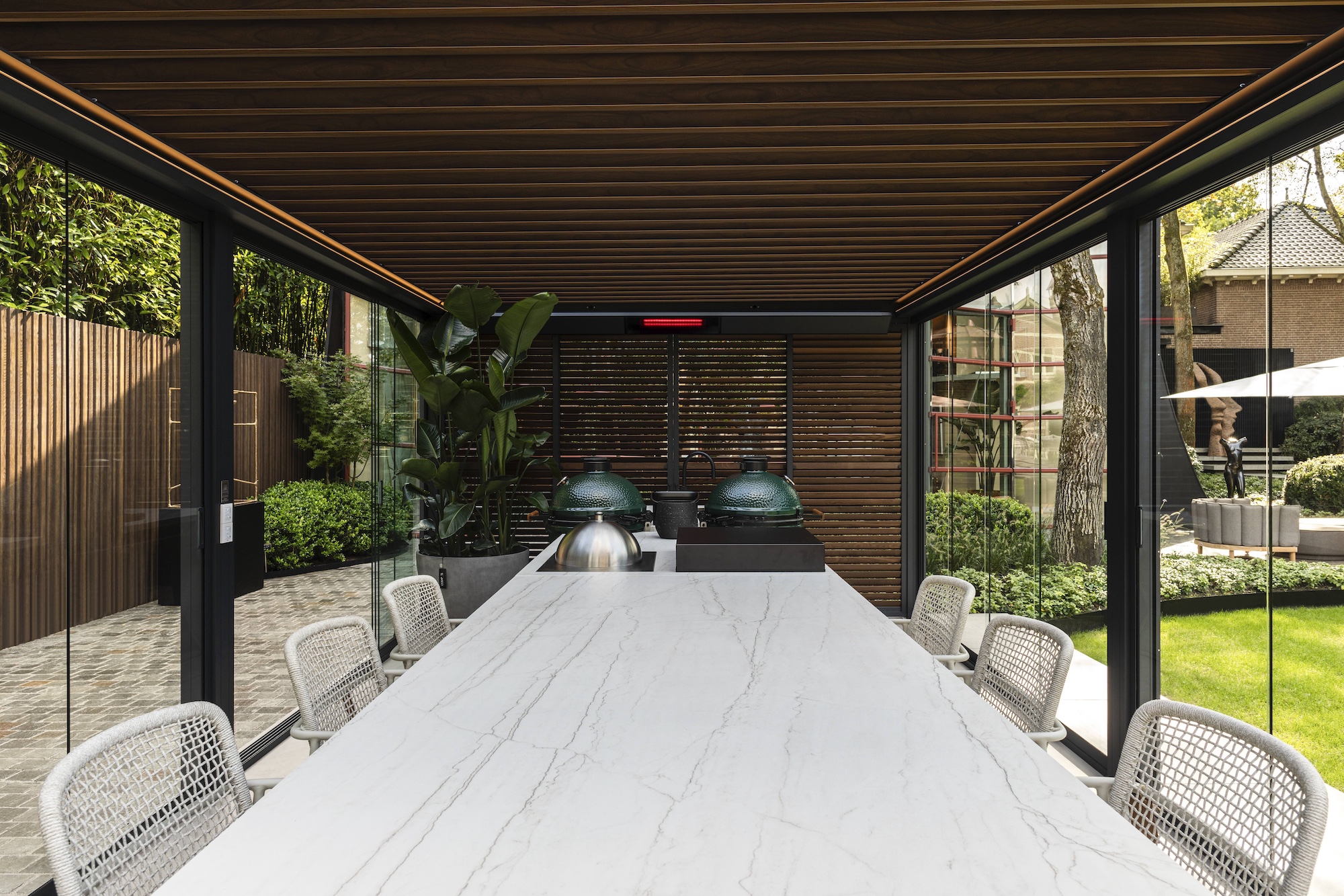 Een van de blikvangers in de tuin van Villa Arte is de Renson Amani lameloverkapping. Deze terrasoverkapping combineert esthetiek met functionaliteit en is uitgerust met een scala aan premium features. De Amani biedt optimaal comfort dankzij de verstelbare lamellen die voor schaduw en ventilatie zorgen. Wat deze overkapping extra bijzonder maakt, zijn de vouwwanden van natuurlijk Ayous-hout, die niet alleen warmte en karakter aan het ontwerp toevoegen, maar ook flexibel te openen en sluiten zijn, waardoor de ruimte naar wens kan worden aangepast.