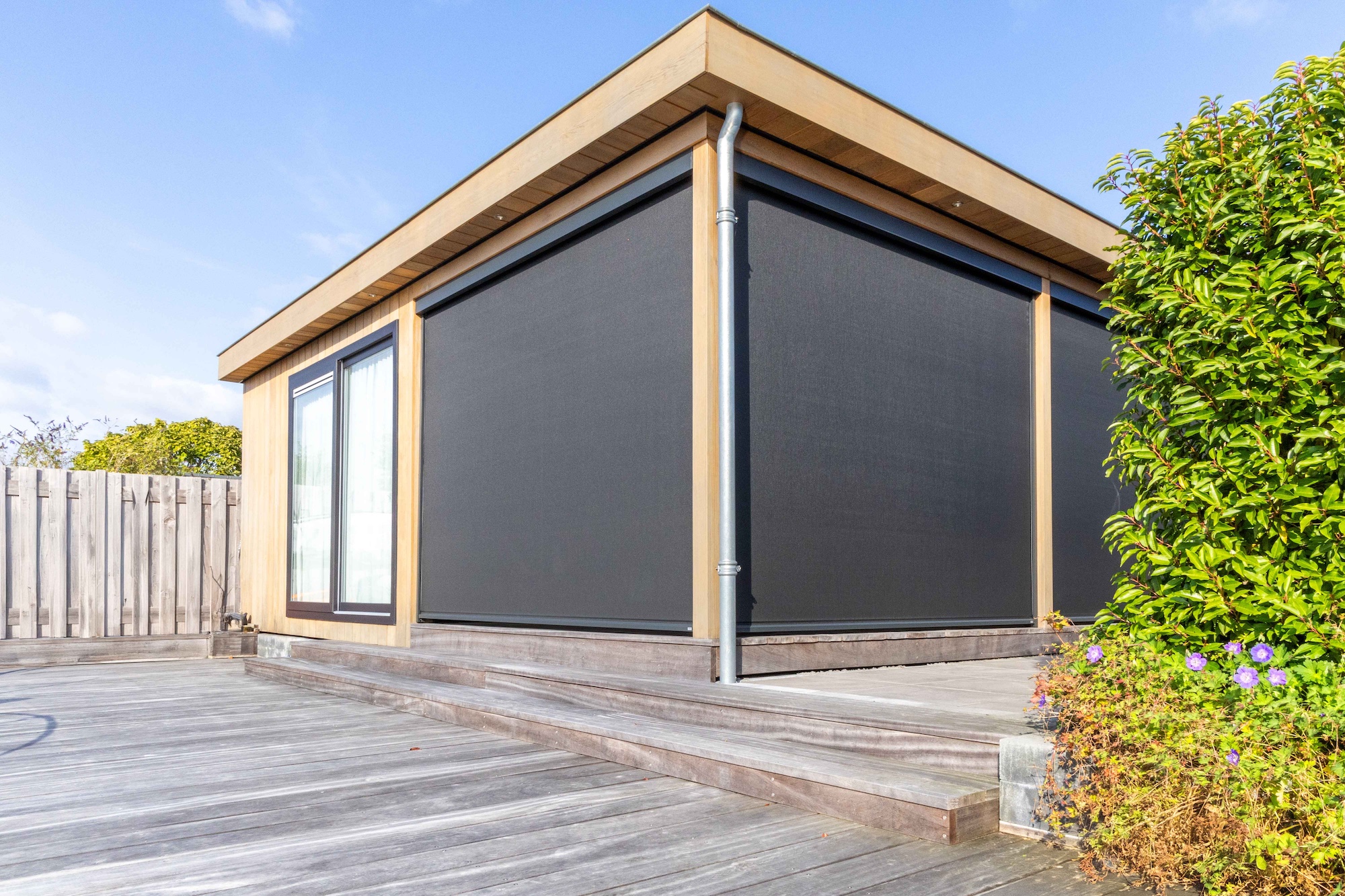 "We hebben gekozen voor een zwarte kleur voor zowel het doek als het frame, omdat dat er niet alleen stijlvol uitziet, maar ook mooi aansluit bij de veranda en het huis. De zwarte screens bieden ons niet alleen privacy, maar helpen ook de veranda op te warmen in de koudere maanden. Het geheel ziet er strak uit en als de screens omhoog staan, vallen ze bijna niet op."
