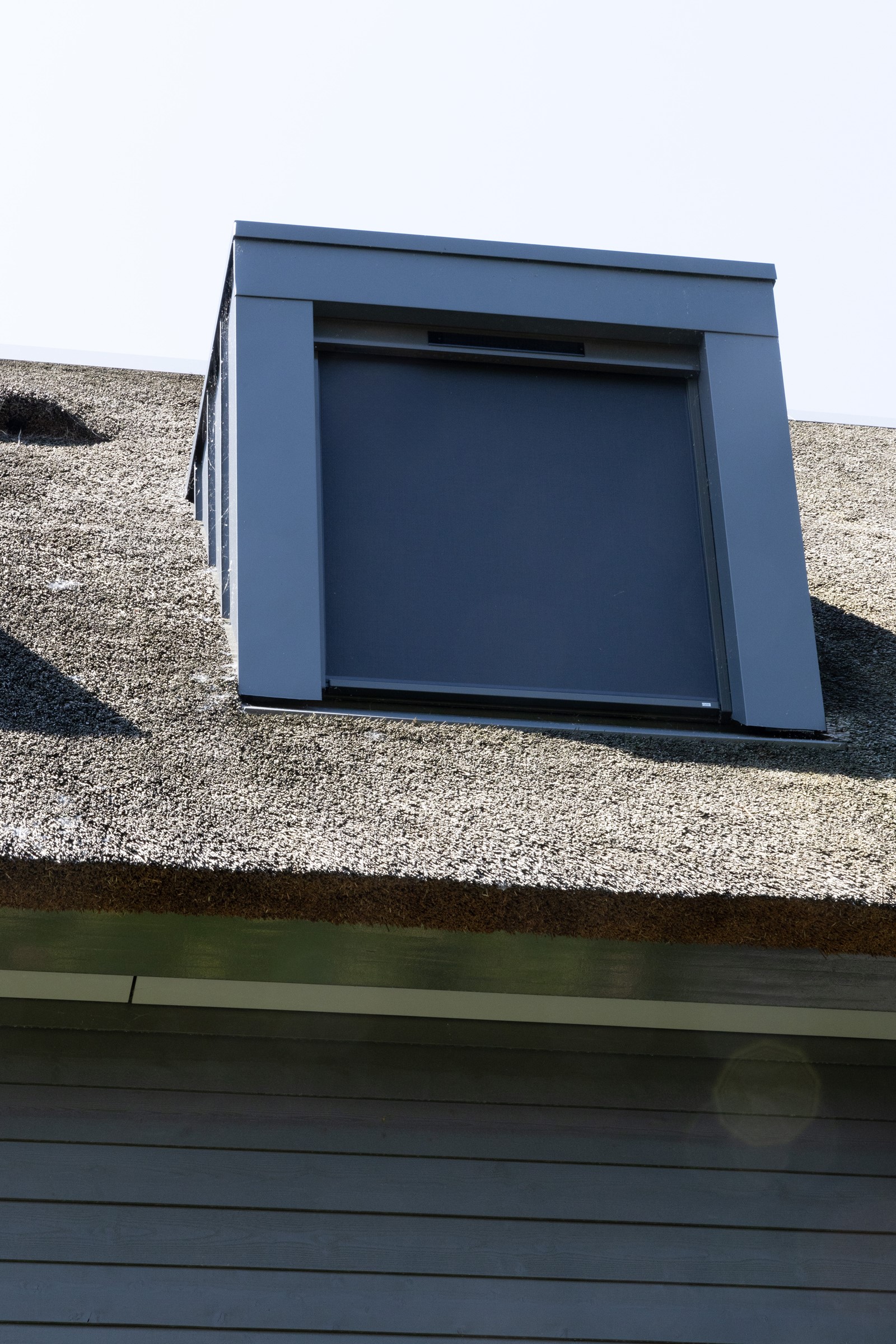 Op de dakkapellen hebben we zipscreens geplaatst die voorzien zijn van solar bediening. Dit systeem is ideaal voor locaties waar geen externe elektriciteitsaansluiting beschikbaar is, aangezien het volledig werkt op zonne-energie. Dankzij de donkergekleurde cassette valt het solar paneel nauwelijks op, wat bijdraagt aan de esthetiek van de woning. De gekozen doekkleur, antracietgrijs, is niet alleen stijlvol, maar ook functioneel. Donkere kleuren stoten namelijk de meeste warmte af, wat bijdraagt aan een koelere leef ruimte.